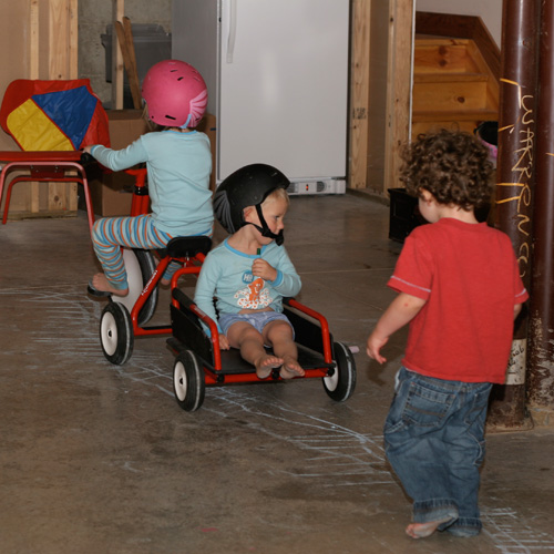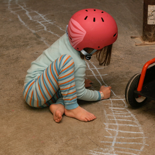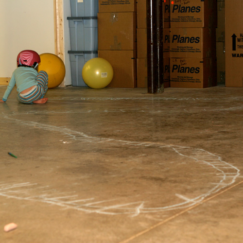 Turns out, having new people enter the house disrupted our downward spiral, and suddenly the kids were being a lot nicer and then so was the Mom. We headed down to the basement where Neko Redeemed Herself With Art. She drew this insanely long train track all around the floor of the basement so the tricycle and trailer could become a roller coaster. These are the moments when I can put aside my ADHD anxieties. She sat there and meticulously drew ties on her track for a good twenty minutes. When she was done, she even drew a platform and cue so that all the riders could stand in line and wait for turns.
