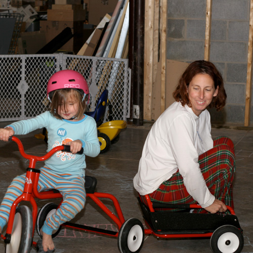 Unfortunately, after a while Shep didn’t want to ride any more. And Chris was so thrilled that Neko had made this big track, that he just wanted to pretend to be a train and run around after her. So I got to be a passenger. And, no, I don’t think even Nicole Ritchie could fit her butt in the back of this trailer, so I did the best I could.