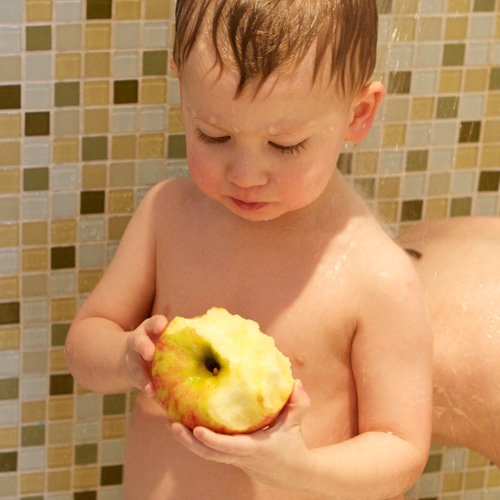 So today, in lieu of basement time? A morning shower with a special bonus. Apples IN the shower. I’m sure that’s in some Montessori book somewhere.