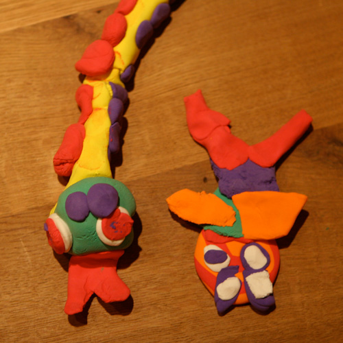 We cracked out some Model Magic today. It had been sitting in a bin for some time, so we were a bit challenged to find some that was easy enough to work with. But Neko was determined, and came up with these two pieces.