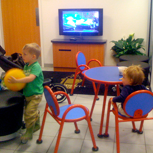 I usually spend my service appointments at the closely-located Target. I load the kids up in the stroller, and we wander the aisles for an hour or so. But today? Thanks to a hefty service and a new tire, the appointment clocked in at 3 hours. I was delighted to discover that the waiting room had been renovated to include a whole kid's area, including a seating area and their very own television.