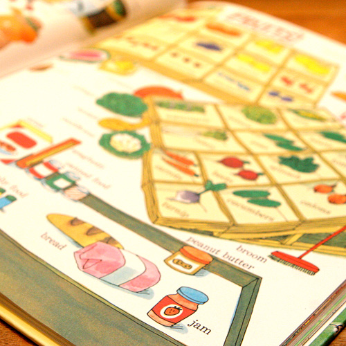 I read him the first few pages and then told him he could hang onto it and look though the pictures during quiet time. Some time later he started calling for me rather insistently, and when I arrived, he pointed to lower corner of the grocery store spread. "Look! It's JAM." It was as if he had just discovered buried treasure in that jar of jam.
