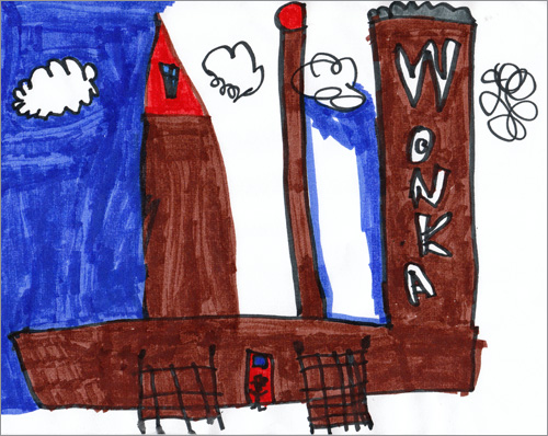 Neko had seen part of Willy Wonka at school. She had been asking to see the rest of it, so I rented it from the library. While we didn't make it through the whole thing (too creepy), she was determined to draw some of it. She made me freeze on the factory and spent a long time drawing it.