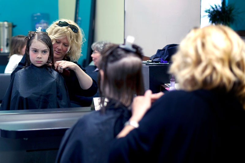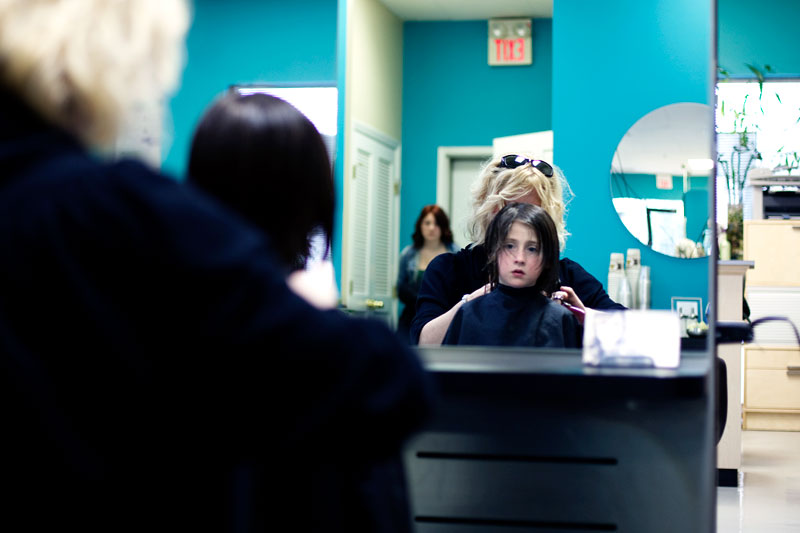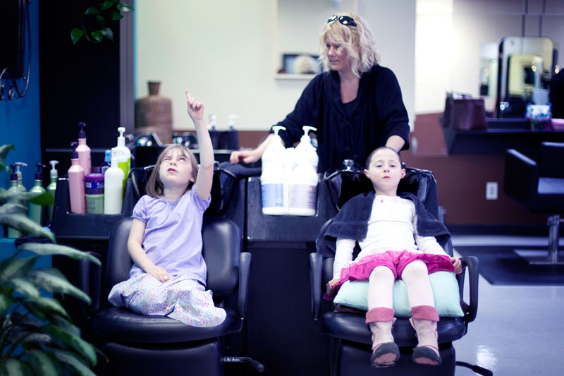 Recently both Nancy H. and I started getting the girls' hair cut at our mutual salon. But the experience? Still somewhat traumatic. This time around, Nancy booked appointments for both girls together. And it went off without a hitch.