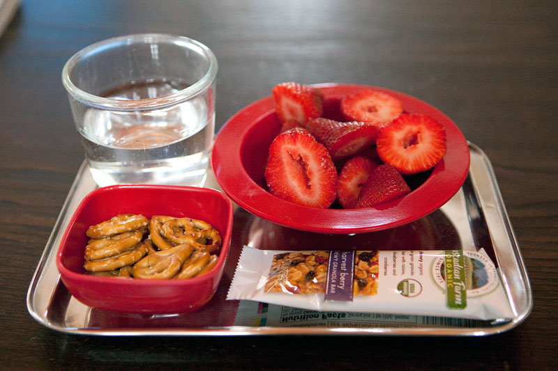 A few minutes later, she appeared around the corner with this tray. She assembled a snack to make me feel better. She poured the drink, cut the tops off the strawberries, and carefully laid it out. And I almost cried.