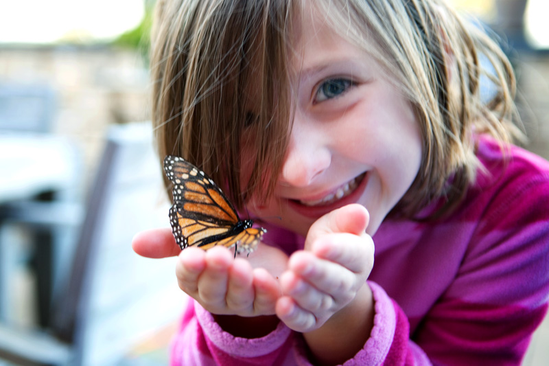 Neko found this injured butterfly. One wing ragged, it was pretty clear she wasn't going to make it to Mexico. It was the best pet for several days, sitting happily on her hand.
