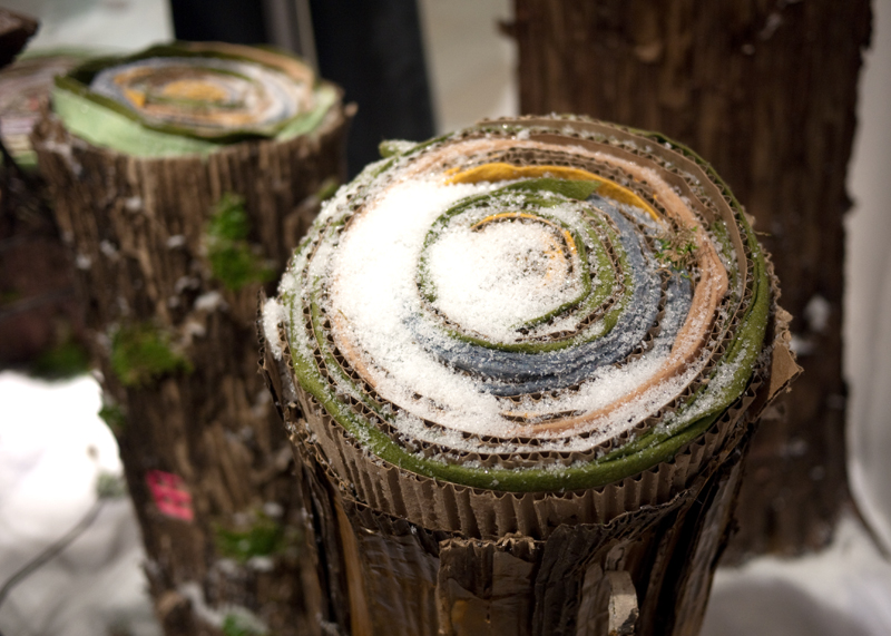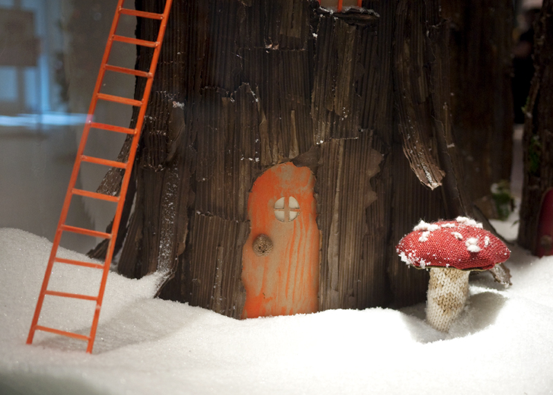 Anyway, with fairy houses being rather popular in our house, I especially adored this concept. I chatted up one of the salespeople and discovered that they are constructed out of cardboard boxes—cut, painted and rolled into tree trunks, and then painted again. Simple x-acto cuts create spaces for windows and doors, and snipped and glued balsa wood to craft ladders and frames. Voila! A veritable fairy village.