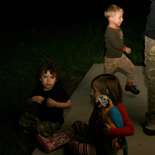 Thank goodness one of the best views of the fireworks is in my parents’ front yard. It took a bit of juggling, Doug playing the role of the Child Whisperer, and repeated showings of Word World, but we all made it out to see the fireworks, even though nearly everyone was in pajamas.
