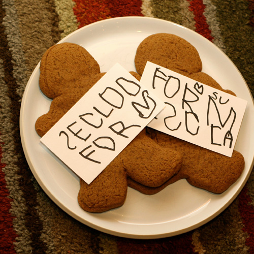 To make this an even ridiculously longer entry than necessary, I’ll mention that I’m not really sure how I feel about the whole Santa thing. I love the magic and the excitement, but I don’t like the whole idea that you’re essentially lying to your kids. I’ve settled on being a bit vague and not really pushing any of the ideas. I think Neko got the cookie thing from our Olivia Xmas book, and since she initiated, we ran with it. And omigosh, it gets even cuter when she writes her own note to Santa. And then we thought we’d leave a cookie for Mrs. Claus, too, since, let’s face it, she’s probably the brains of the operation.