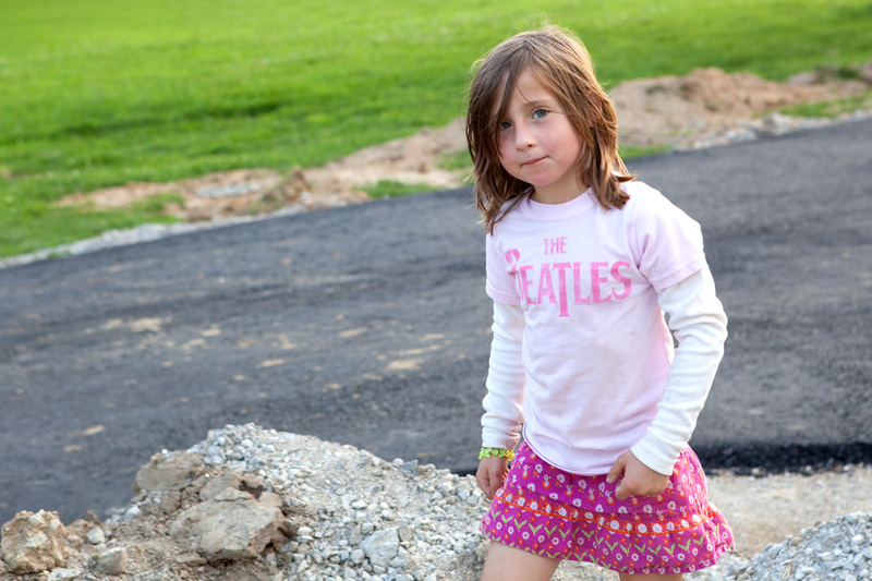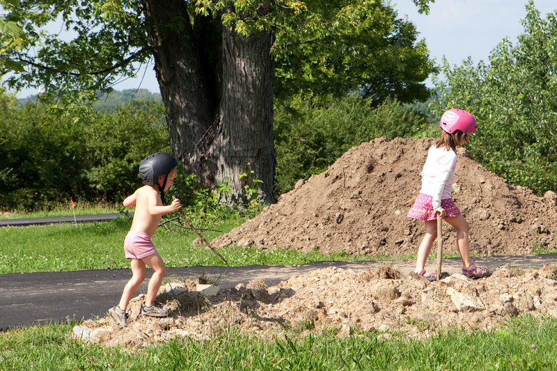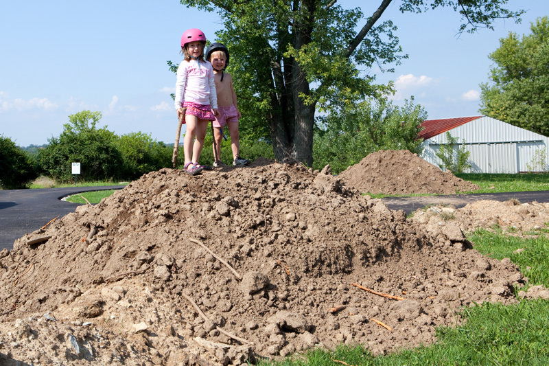 Because the new driveway is about six inches thick, they dumped these huge mounds of dirt in our yard to regrade the edges. The kids are ecstatic. We spent the better part of the evening outside, climbing up and down. Throwing rocks. The kids decided it was Utah, and went hiking and exploring. Pretending it was a slide. The kids were downright filthy. Glorious summer fun.
