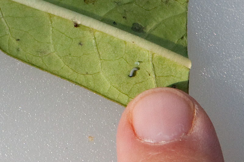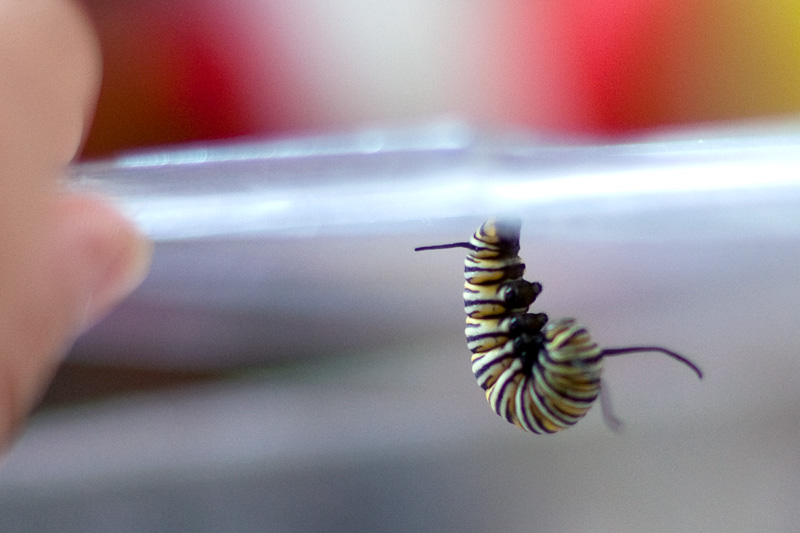 I’m proud to announce we are the parents of nine baby monarch caterpillars. Another parent at school gave us some monarch eggs he gathered so we could experience the life cycle. Today they hatched! My desperately-in-need-of-a-manicure finger included for scale. They are SO TINY.