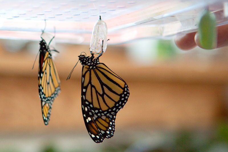 Our first two monarchs emerged while we were out this morning. Our junior naturalists are ecstatic, but having a bit of a hard time thinking about letting them go.