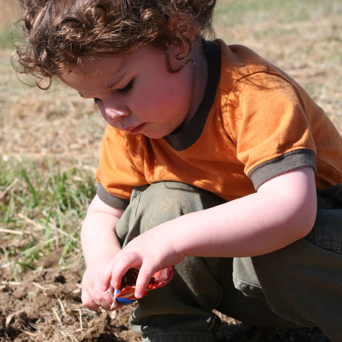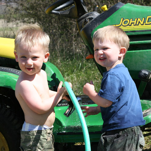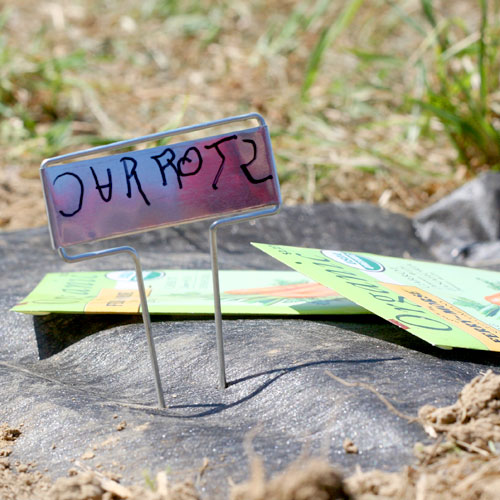 So we’ve got carrots here, corn there. A bed of flowers beyond that. Beans and zucchini somewhere in between. We’ll be happy just to see veggies of any kind emerge, and even if we don’t get that, I still think it’s a great experience for the kids. They hung in there for quite some time, digging and staking while we waved our hands around and tried to make a plan. Tom got out the hose and had them “clean” the mower. Everyone planted a little bit of something, even if it wasn’t quite in the bed.