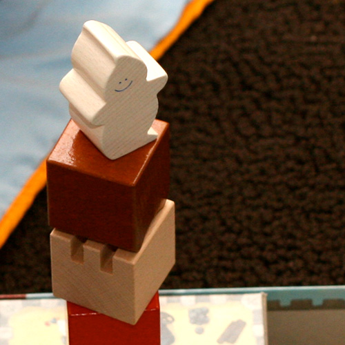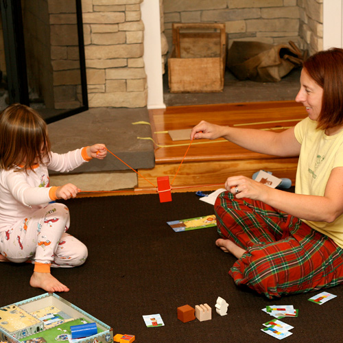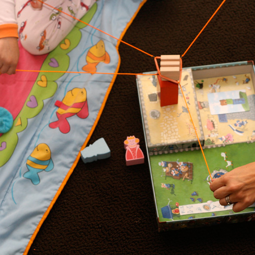 I’m trying to take advantage of the hour she stays up later than the others. Tonight we cracked out a new game. This one is hard to describe, but essentially you are asked to build three “towers” which are a combination of blocks indicated by a card you draw out of a deck. You then use this crazy tool which is four “handles” attached to an elastic. Each person takes two handles and when you pull them, you can stretch it around a block and then use it to move it to your “castle” to build a tower. Plus, it’s cooperative instead of competitive, which is good, because we’re in a big-time “I win!” phase. Okay, it sounds weird, but Neko LOVED it.