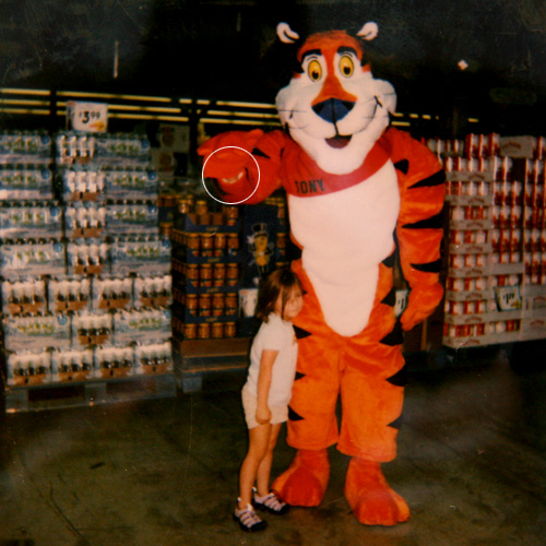 Now, she’s got some suspicions that perhaps this isn’t a real six-foot tall live tiger in the grocery store. She’s begun talking about how this is a costume and that there’s a person in there. But today it was like she finally got the proof to crack the case. Later, at home, she was examining her polaroid when she suddenly started pointing at the picture and screaming, “Skin! SKIN!”