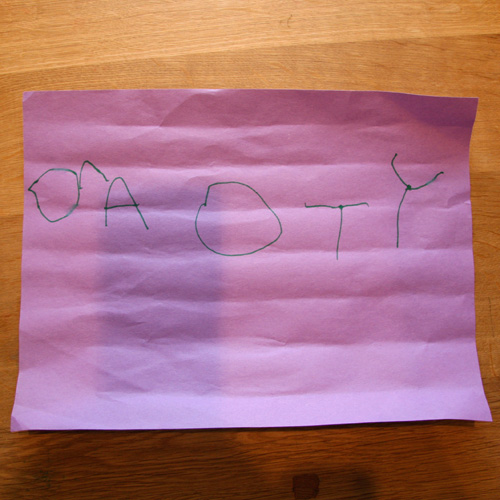 “I have a note for you,” she said as she handed me this purple paper. In case you can’t read it, it says “Toady” which is the name of the toad that sat waiting for me in her new bug bucket. We marveled at the toad, at how big she was in comparison to the last toad.