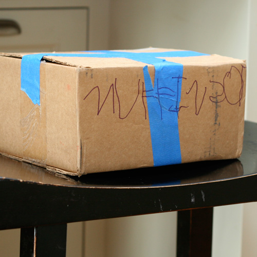What you don’t see in this picture is that the gift was wrapped once, and then she decided she needed to wrap the wrapped gift. So I dug up a box, and she gave that the treatment, too.