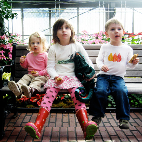 Of course, I forgot the big camera, and dug out my point-and-shoot when my brood got so cranky they all needed a snack break. At the Conservatory, where food is strictly forbidden. So I parked them on the bench, smuggled out some granola bars, and realized I had one moment to snap a quick picture. While they're chewing, which, you know, is always a quality shot.