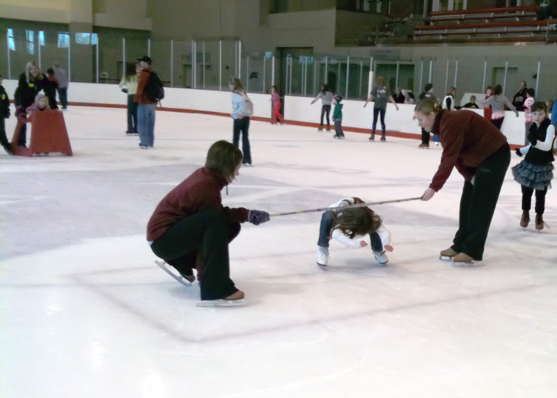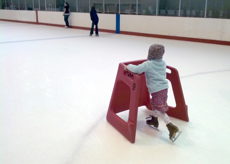 Ellery was nervous, but after a few minutes on the ice with her red pushy-thing, she was whizzing around. Alex was on the ice for the first time, too, so the two of them made quite the big, red, plastic train.
