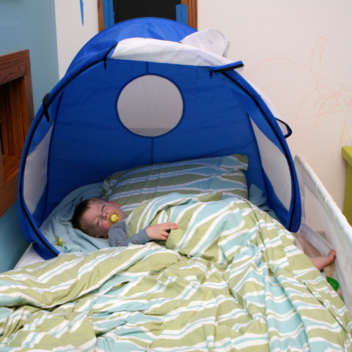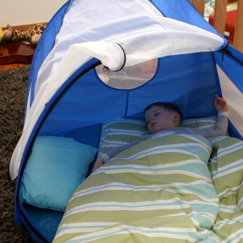 The first night, I switched him over to his bed after he fell asleep, thinking he wouldn’t remember where he’d fallen asleep. But at 2am he woke screaming and wouldn’t quiet down until we’d tucked him back into the tent.