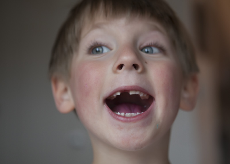 The adult tooth pushed and pushed. The baby tooth stood its ground. The baby tooth is migrating left, and now stands at a 45 degree angle from the rest of his teeth. It’s wiggly, but still firmly in place.