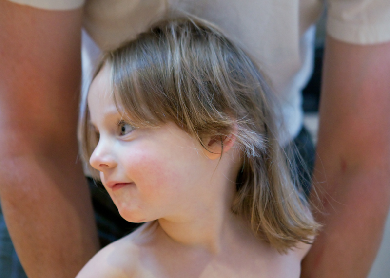 As I entered the bathroom, the first thing I saw was all her long, baby fine hair gathered around her feet. And the scissors. And my heart sinking into my shoes.