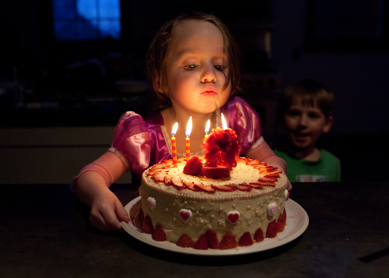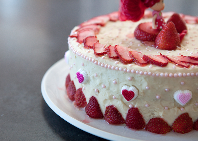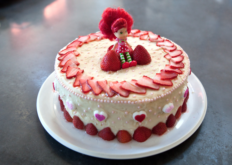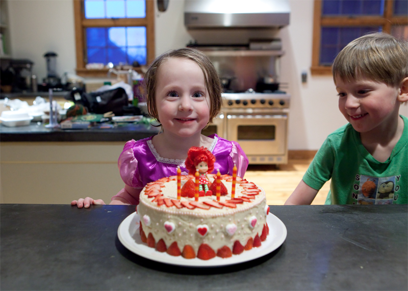 Without me even asking, you informed me that for your birthday you would like a cinnamon cake with strawberries (the fruit) and Strawberry Shortcake (the character). This seemed such a strange flavor combination to me that I warned everyone as I served cake that it might not jive. But you know what? It was really good. I should have trusted that you’d call a winner.