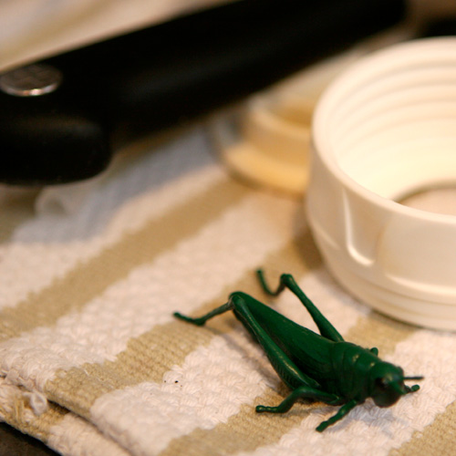 So now I don’t even flinch when I encounter that massive brown (plastic) spider in the shower or the (plastic) grasshopper with the drying dishes. Desensitization or sleep-deprivation, I’m not quite sure, but it seems to be working.