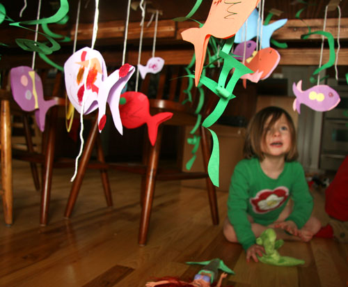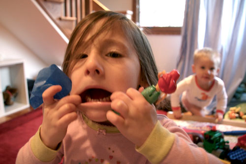 I guess I had in my mind that we’d delicately sprinkle glitter on the hearts and then pick one precious jewel for each heart. Well, Neko hasn’t perfected her scissors skills yet, so she couldn’t cut hearts. And then it just turned into a big contest of how much glitter, glue and jewels would fit on one heart. They took ages to dry.