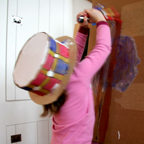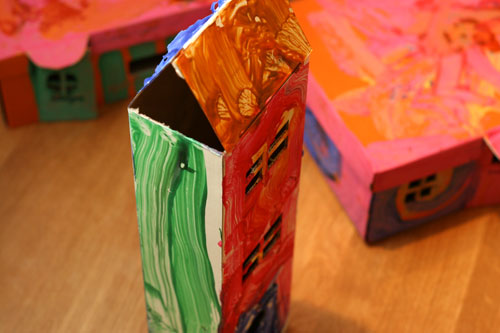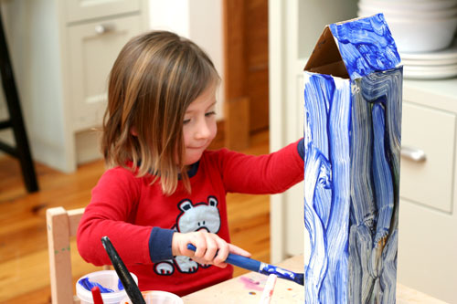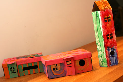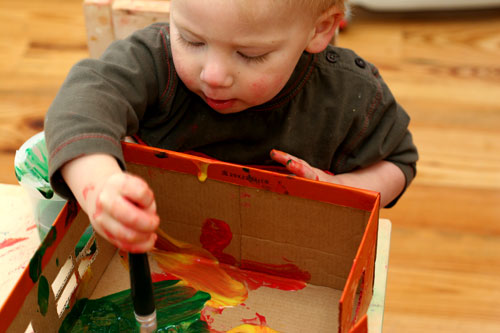 I prepped ahead of time by cutting doors and windows in shoeboxes. When the kids got up, we painted and decorated. Even Shep got into the project, although he was more excited about painting inside the boxes than the outside.